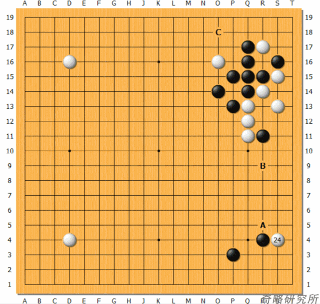AI认为实战白22缓了,黑23更是贻误战机,应该在B位跳。因为黑23错过时机,白棋无需再重视右边,可以在上边C位跳,转移至上边一带,胜率将升至61%(好像也没啥区别?)。