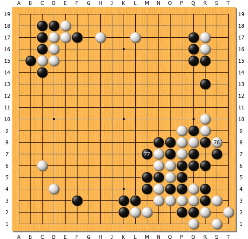 此为第四局(最后一局)的进程,局部下到黑77吃住白棋四子告一段落,黑棋已经有了巨大优势。如今在AI的判断中,这个黑棋的胜率为99.6%。