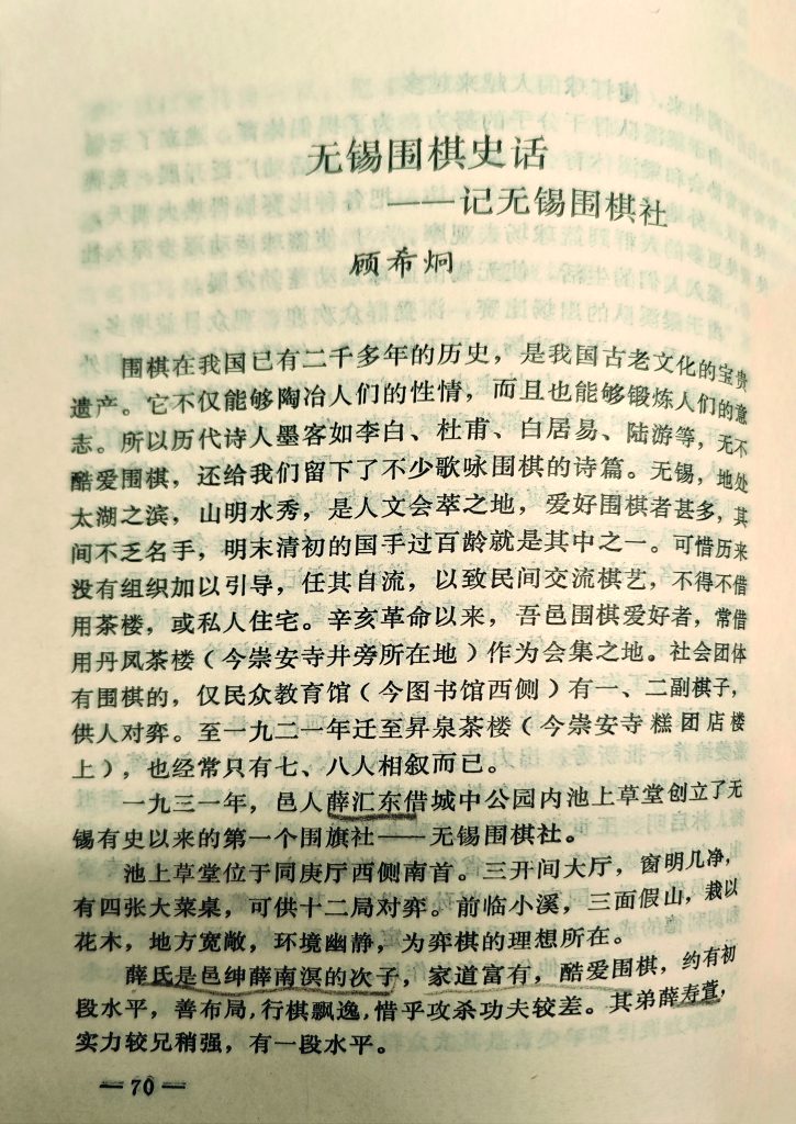 据无锡的文史资料记载,无锡人薛汇东(1897-1965年)于1931年在无锡城中公园池上草堂创立了无锡围棋社。薛汇东,名学海,字汇东,是中国近代体育史上的名人,晚清驻英、法、比、意四国公使薛福成之孙,无锡富商薛南溟之子,为无锡的围棋、篮球、田径运动做出过重大贡献,著有《百米缤纷录》《薛学海体育论文集》。早年就读于清华学堂,1914年留学美国,毕业于安杜佛高等学校和威斯康星大学经济系。他是一位运动健将,曾以整10秒的成绩获全美大学生运动会百米冠军,并获得荣誉奖章。1918年回国,任北京汇文大学体育教练后于北洋政府任职。